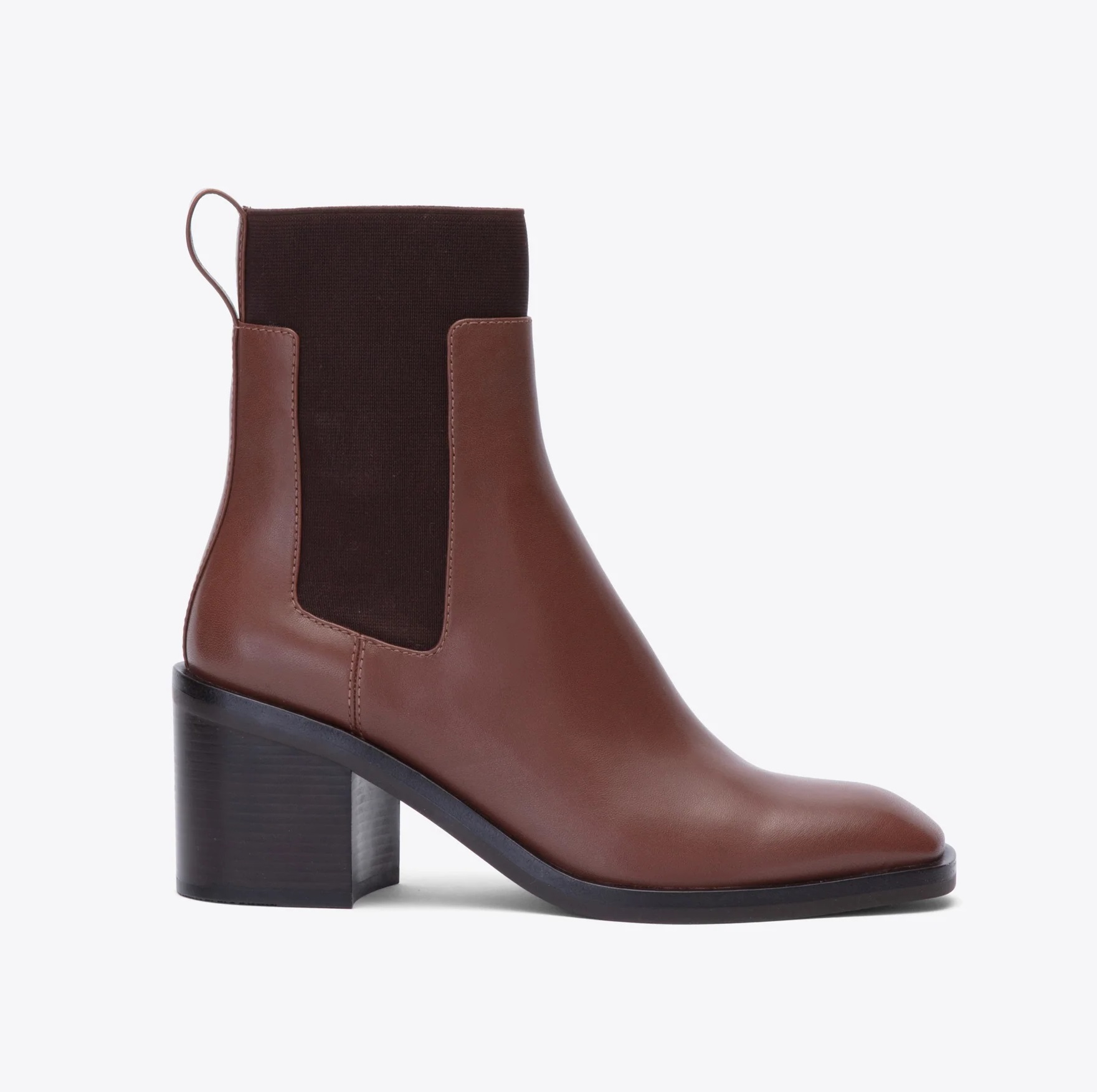 Our best selling Alexa Chelsea in 70mm block heel. Realized in our luxe smooth leather, it features a square toe and elasticated side panels. Back pull tab allows for easy access, and a rubberized outsole offers stability.