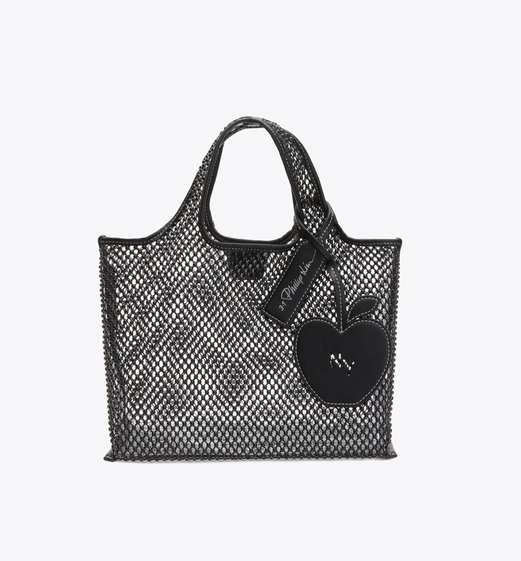 The Mini Market Tote offers a playful twist on the classic lunch bag. This charming design features is crafted with mesh hot-fixed with cabochons that adds a touch of whimsy, while the silver-tone metal logo plaque enhances its contemporary appeal. Perfectly sized for your essentials, this tote brings a fun, stylish flair to your everyday outings.