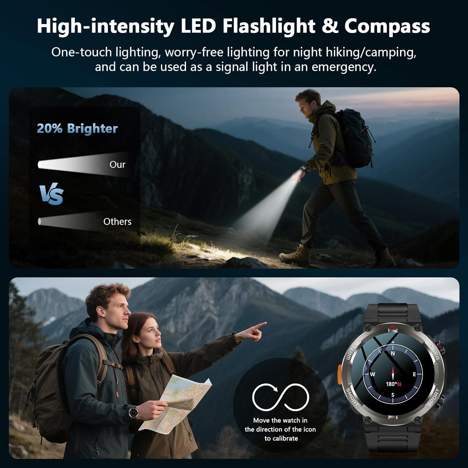 - 【LED Flashlight and Navigation Compass】The smart watches for men features a high-brightness LED flashlight with a beam distance of up to 10 meters, offering both constant-on and SOS distress modes. The light is stable and has strong penetrating power, providing excellent illumination even in harsh environments such as dusty or foggy conditions. Meanwhile, its high-precision antimagnetic compass provides reliable directional guidance for outdoor activities. Designed specifically for dense forests and rugged terrain, it’s an essential navigation and survival tool.