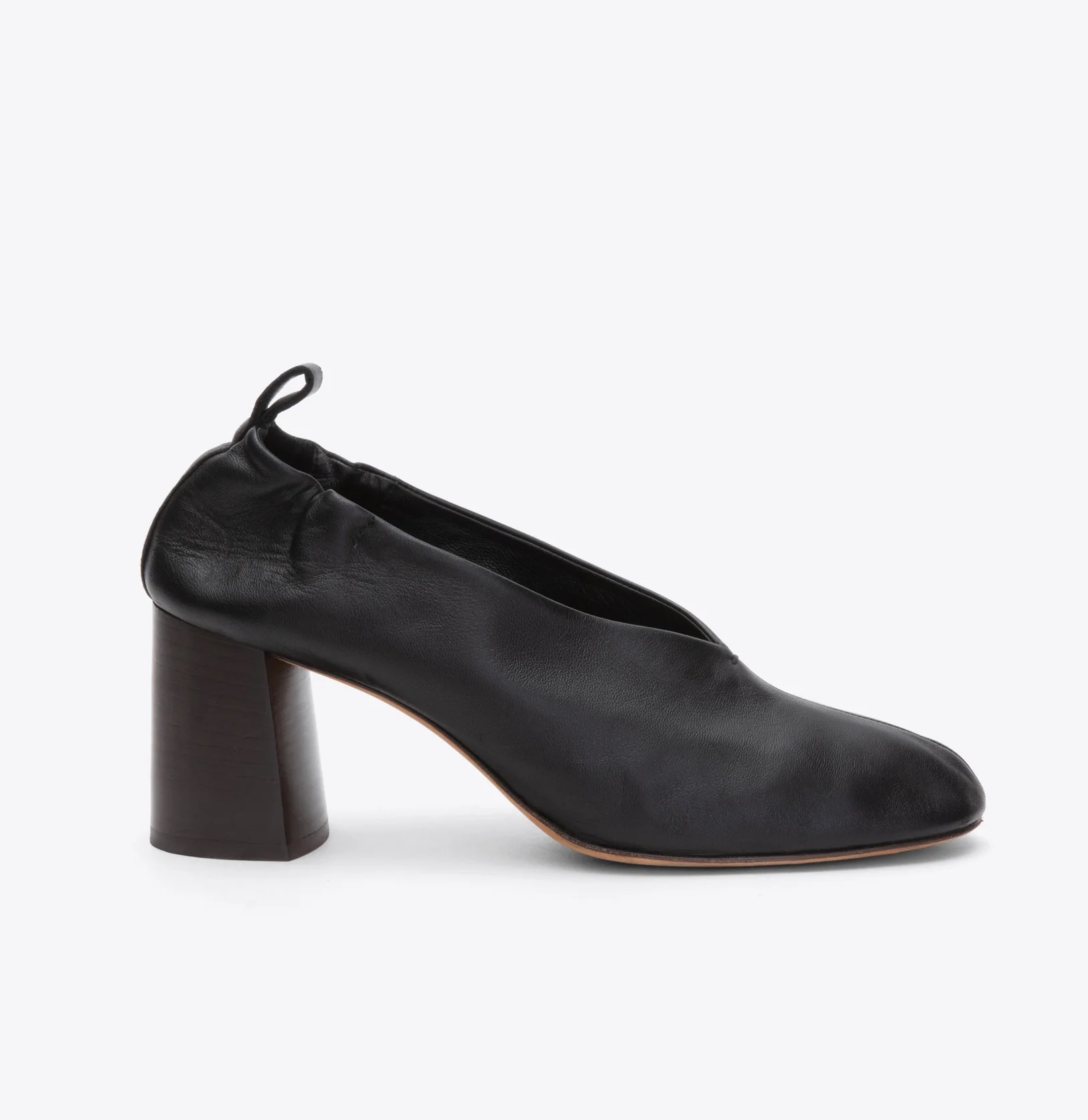 Nadia heeled ballerina pump with a ruched upper and elasticated back. Slight tapered toe and high block heel. Slip on style with back pull tab.