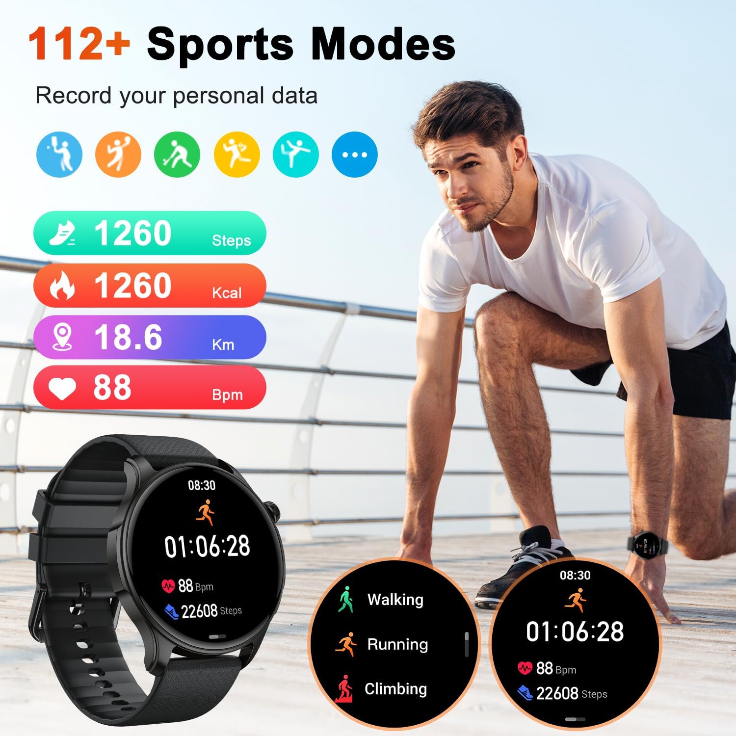 • 120+ Sports Modes & IP68 Waterproof: fitness watches for men women supports 120+ sports modes (running, cycling, basketball, yoga,swimming,workouts, strength training, and free exercise) — delivering accurate and scientific data for a wide range of indoor and outdoor activities.Running watches for men precisely tracks steps, calories burned,distance,and workout duration.Digital watch men women is IP68 waterproof, you can confidently use it while swimming, sweating, or washing your hands.