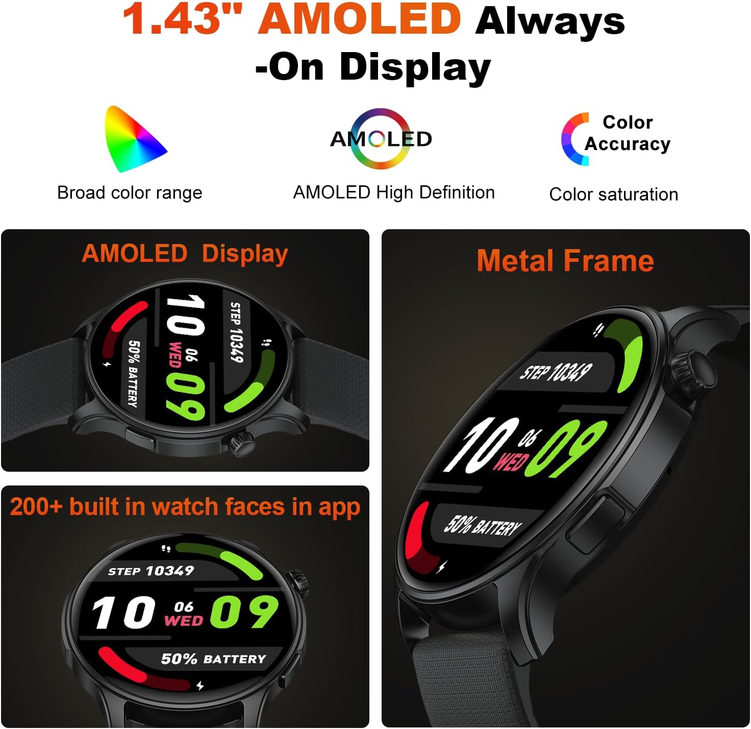 • 1.43” AMOLED Screen & 200 Watch Faces: The ios android smart watch is equipped with an ultra-clear AMOLED color touch screen with a resolution of 466*466, allowing you to view information and data more clearly and easily.ios android watch for men come with 2 watch straps of different colors. With over 200 dials in various styles to choose from, you can also upload photos of family, pets, or scenery to create a personalized watch face that reflects your unique style.