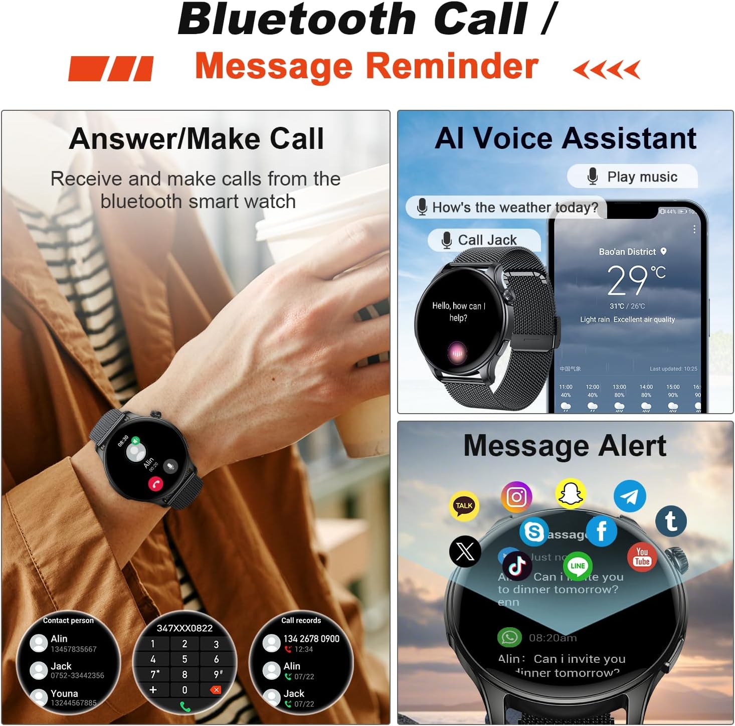 - Bluetooth Call & Messaging Notification: Smart watch with text and call can support most android and iOS phone(andriod 5.0 and above iOS 9.0 and above). with a built-in hi-fi speaker and microphone, Calorie counter watch supports bluetooth to make and receive calls, receive message alerts, play music and voice assistants, freeing your hands from your cell phone and allowing for freer communication. sports watch also receive social media,WhatsApp,Facebookand SMS alerts right on your wrist.