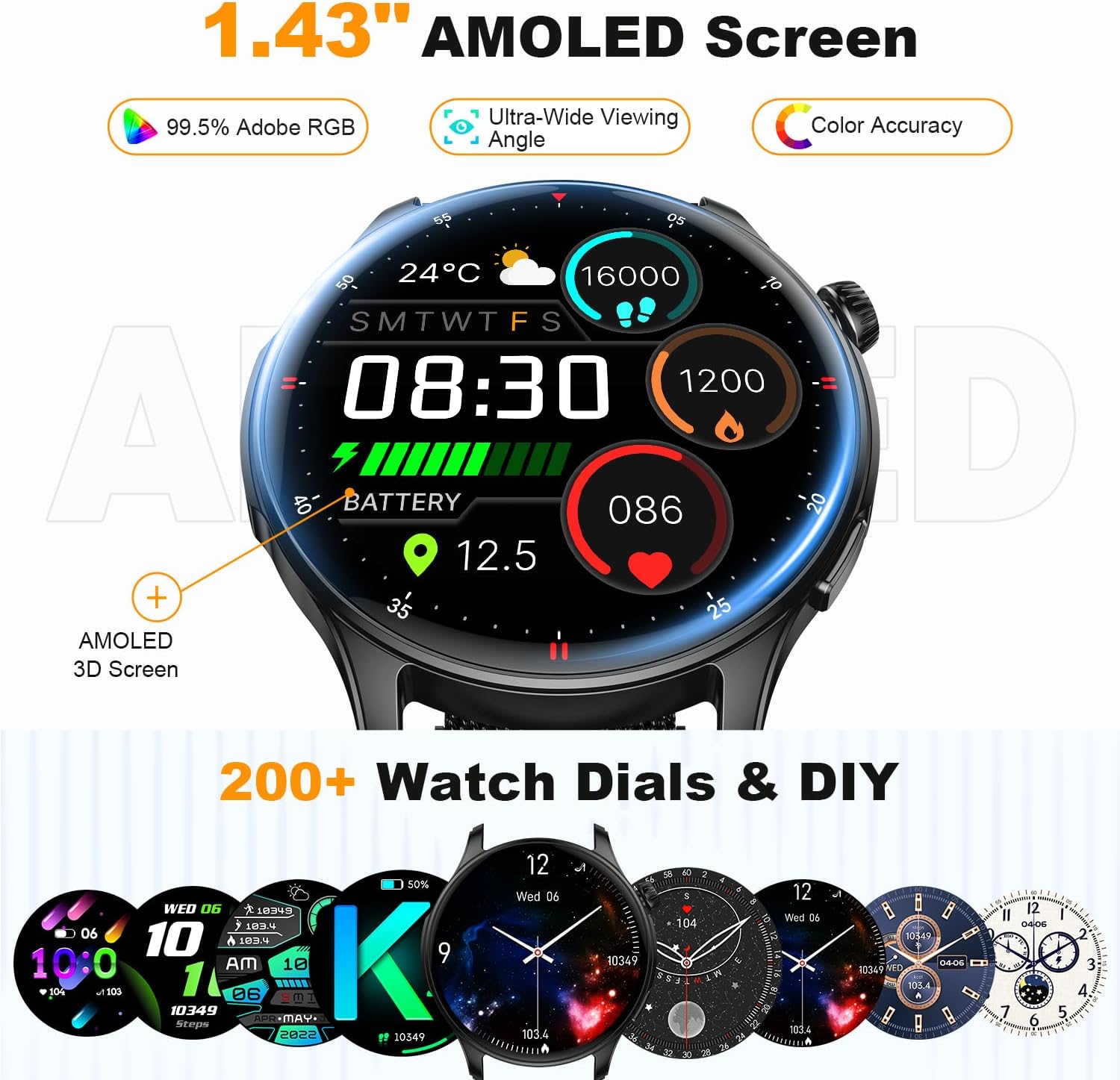 - 1.43″ AMOLED touchscreen for clear visuals: The ios android smart watch is equipped with a AMOLED color screen, delivering superior image quality and touch sensitivity. Step counter watch has over 200 unique online dials available, you can also customize the watch face using any photo—such as pictures of family, pets, and more—to create a truly unique look.Calorie counter watch come with 2 watch straps of different colors.